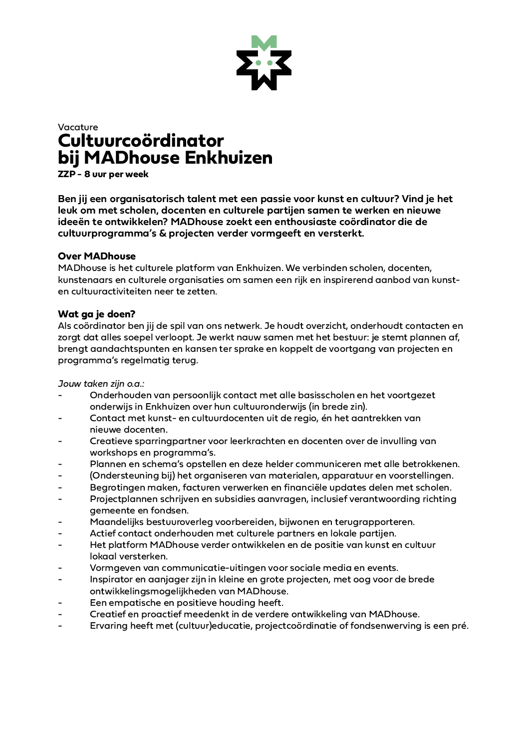 Ben jij een organisatorisch talent met een passie voor kunst en cultuur? Vind je het leuk om met scholen, docenten en culturele partijen samen te werken en nieuwe ideeën te ontwikkelen? MADhouse zoekt een enthousiaste coördinator die de cultuurprogramma’s & projecten verder vormgeeft en versterkt.